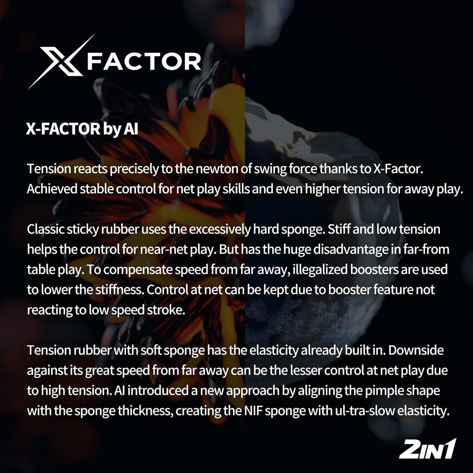 The Jekyll & Hyde C55.0 table tennis rubber is the first to feature dual tension that doesn't require additional boosters, as the dual tension is already integrated into the design. The Jekyll & Hyde C55.0 has a thicker top sheet with shorter and more densely arranged pimples. The top sheet is specially coated for optimized stickiness, and the minimized gap between the top sheet and the sponge ensures better integration. This results in a clearer and more intuitive feel when striking the ball. The sponge features smaller and more uniformly distributed bubbles. The low pimple geometry enhances energy transfer from the sponge, allowing for more powerful and direct hits, even when playing from a distance.