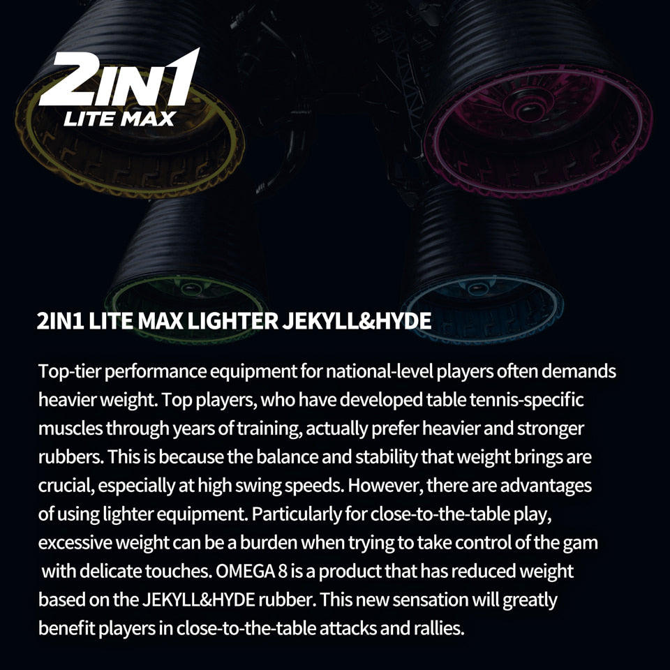 Top-tier performance equipment for national-level players often demands heavier weight. Top players, who have developed table tennis-specific muscles through years of training, actually prefer heavier and stronger rubbers. This is because the balance and stability that weight brings are crucial, especially at high swing speeds. However, there are advantages of using lighter equipment. Particularly for close-to-the-table play, excessive weight can be a burden when trying to take control of the game with delicate touches. OMEGA 8 is a product that has reduced weight based on the JEKYLL&HYDE rubber.
